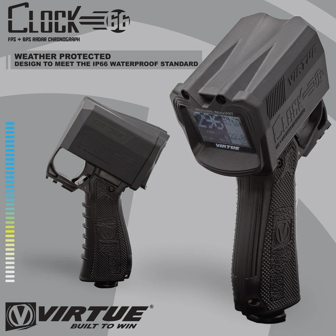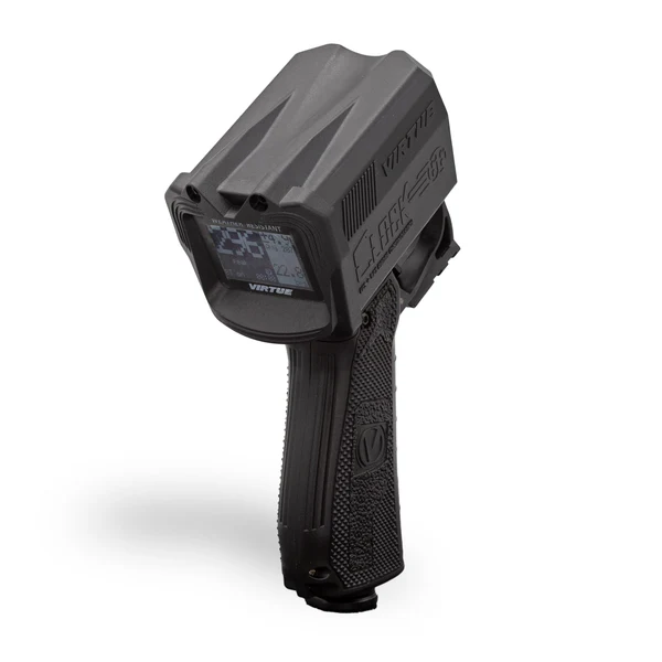 Le Clock 66 est le chronographe de paintball nouvelle génération, offrant une fiabilité et des performances considérablement améliorées. Depuis plus de dix ans, il fait référence dans le secteur. Terrains, ligues, équipes et joueurs peuvent compter sur le Clock 66 pour obtenir rapidement et précisément la vitesse (en pieds par seconde), la cadence de tir (en billes par seconde), ainsi que des données de performance clés telles que le pic de billes par seconde, le pic de tirs par seconde, le tir moyen et l’écart type d’une série, afin de mesurer la régularité de leur marqueur et de leurs billes. De plus, le Clock peut diffuser des flux de billes prolongés via Bluetooth vers la plupart des appareils mobiles grâce à l’application Virtue Paintball + (Apple et Android), pour des mesures détaillées de la régularité des tirs.